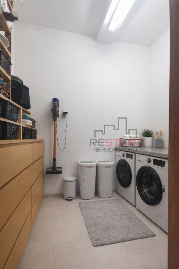 Sercem domu jest przestronny, jasny salon połączony z nowoczesnym aneksem kuchennym, wyposażonym w meble na wymiar oraz sprzęt AGD firmy Samsung. Funkcjonalność kuchni podnosi oddzielna spiżarnia, a codzienny komfort uzupełnia osobna pralnia.